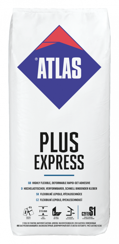 ATLAS PLUS EXPRESS ist ein schnell abbindender grauer C2FTE S1-Kleber für Fliesen im Innen- und Außenbereich, auf Wand und Boden.
